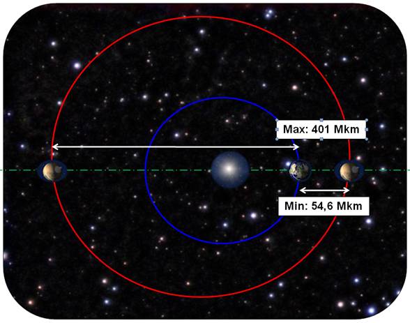 tous les 780 jours. Le rapprochement record (55,7 millions de km) eut lieu en