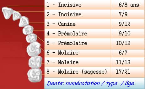 comporte huit dents numérotées de 1 à 8. L'âge d'apparition des dents