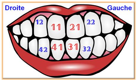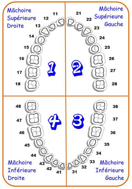 devant (dizaine) indique quel est le quart de mâchoire concerné. La mâchoire inférieure est