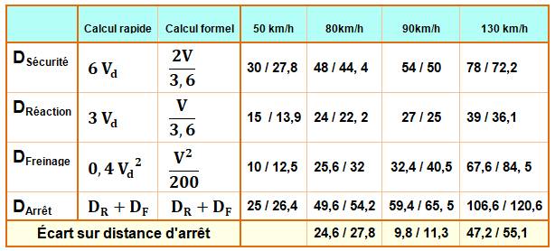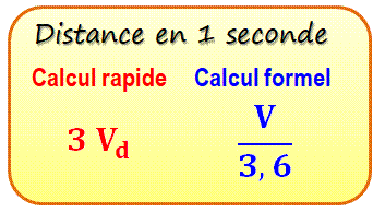 Règle de calcul rapide La distance parcourue en une seconde est égale à 3 fois les dizaines de la vitesse. Exemple 80 km/h => 3x 8 = 24 m en une seconde Alors que le calcul formel donne: 22,22 m |
