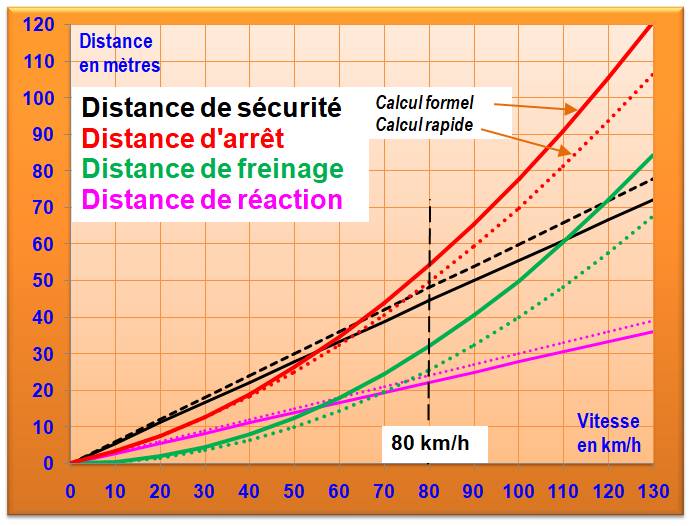 km/h Distance de sécurité: 6 x 8 = 48 m En vérité: En 2 secondes: 80 x 2 / 3,6 = 44, 44 m En pratique Espace correspondant à deux bandes