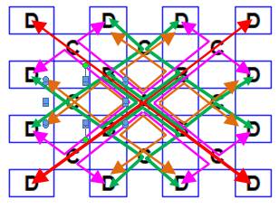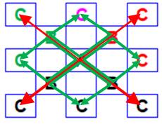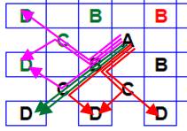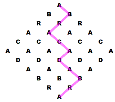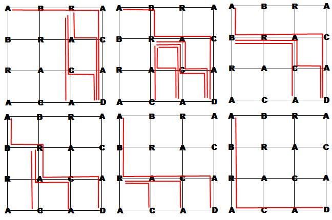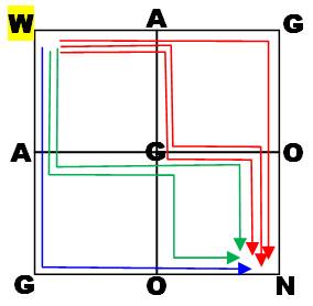 des dénombrements (2, 4, 8 ou 12). Chaque lecture est appelée un mot, chacun représenté par un chemin sur la grille. Le chemin part d'une lettre origine, dite pivot, et se dirige vers la lettre suivante: