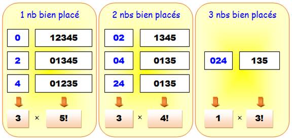 et 5), il y a factorielle 3 possibilités. Soit le produit: 1 x 3! Quantité de cas avec les nombres