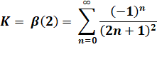 Somme des inverses des carrés des impairs. Bêta (2) est la fonction bêta de Dirichlet, avec