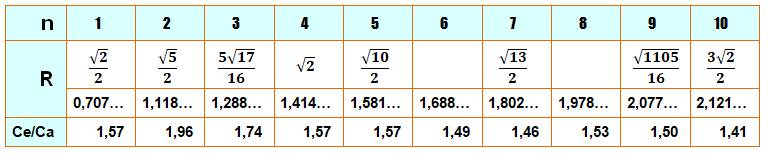 rayon R; Ce/Ca: rapport des aires entre cercle et carrés