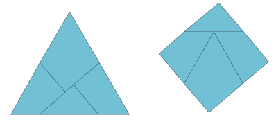 triangle équilatéral à un carré de même aire. La figure colorée montre comment les pièces