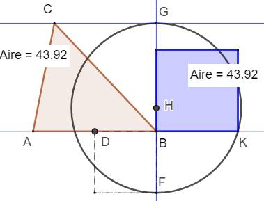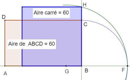H BH est le côté du carré Démonstration BH est moyenne géométrique de BA et BF: BH² = AB . BF = AB . BC Aire du carré