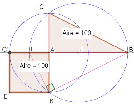 Construction Rectangle ABC. Cercle (A, AC). Intersection avec AB prolongé en C'. I milieu de AC' et J milieu de IB Cercle (J, IJ) Intersection avec AC prolongé en K AK est le côté du carré. Démonstration Triangle IKB inscrit dans un demi-cercle: il est