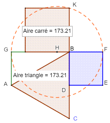 Construction Triangle équilatéral ABC. D est le milieu de BC. Carré de côté BD. H est le milieu de GF. Cercle (H, GF). Intersection en K avec le prolongement de BC. KB est le côté du carré. Démonstration Du même type que celle présentée ci-dessus: |