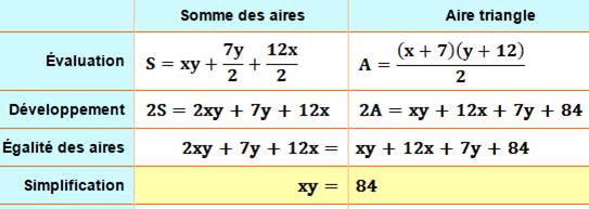compare l'aire du triangle complet à la somme des aires du rectangle et des