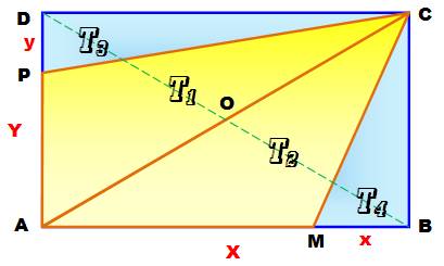 Les triangles T1 et T2 ont la même aire. De même, les triangles T3 et T4 ont même aire. Et cela quelle que soit la position de la parallèlePM à DB |