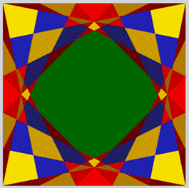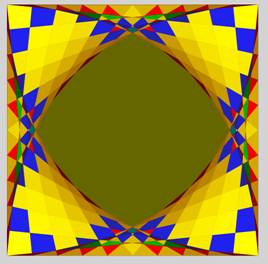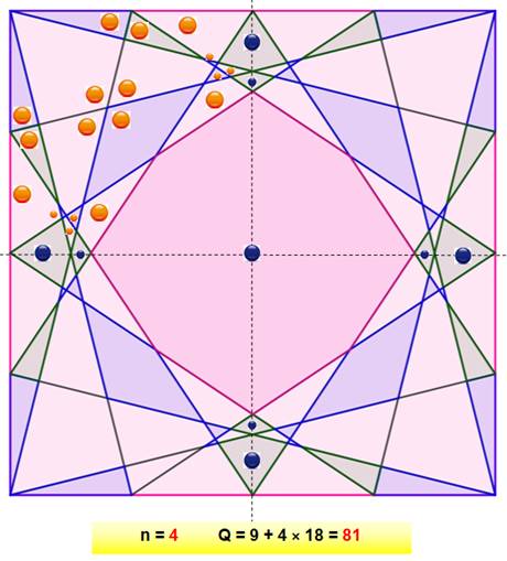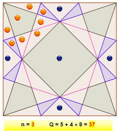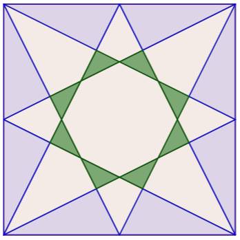 parties égales (k = 2). Un sommet est relié au point milieu opposé. Ces segments découpent le carré en régions. Le but est de compter ces régions. Dénombrement Sur ce cas simple, il facile de compter 25 régions: 3 × 8 = 24 triangles et 1 octogone central. |