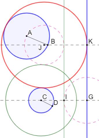 bleus et à la droite bleue. On note: Cercles bleus de rayon AB = r et CD = r'. Construction Cercle vert de centre C et de rayon R + r'. Perpendiculaire en C à la droite. Intersection en G avec la droite bleue. Reporter GI = r Droite en I parallèle à la droite bleue. On est ramené à un problème connu: construction PLC avec le point A la droite verte et le cercle vert. Ce cercle tangent (pointillés roses) a pour