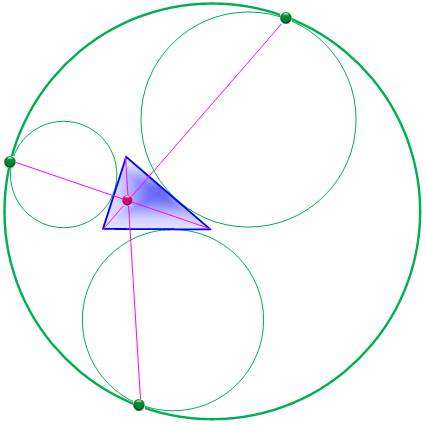 Description Triangle bleu. Ses trois cercles exinscrits. Le cercle circonscrit à ses trois cercles: cercle