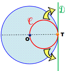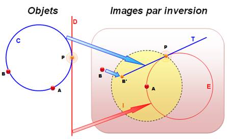 tangences à travers l'inversion. Le cercle bleu C à pour image la droite bleue T. La droite D à pour image le cercle rouge E. La tangence est conservée en P. Problème Trouvez un point permettant de tracer la tangente
