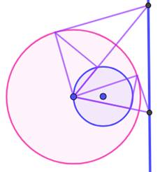 tangent aux cercles bleus et passera par le point A. Note: il existe quatre solutions. |