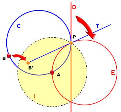 au cercle bleu et passant par les points A et B. Principe La droite D est tangente au cercle image C' du