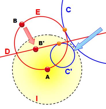 (cercle jaune). Inversion du cercle C en C' (bleus). Inversion du point B en B'. Une tangente D parmi deux aux cercles C' et passant par B'. Inversion de la droite D en cercle E (rouge). Il