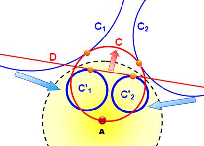 en C'1 et C'2. Une tangente D parmi quatre aux cercles C'1 et C'2. Inversion de la droite D en cercle C. Il sera