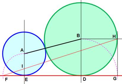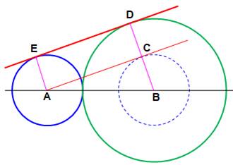 de construire la droite ED tangente aux deux cercles (bleu et vert). Construction Tracer le segment AB de longueur R + r Cercle (A, r) et Cercle (B, R) Cercle en B de rayon r Tangente à ce cercle pointillé depuis A. Perpendiculaire en B à cette tangente qui