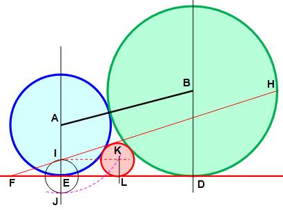 de construire le petit cercle rouge. Construction Cercle (E, EI); intersection J Cercle (A, AJ); Parallèle IK à ED; intersection K Cercle (K, EI); c'est le cercle rouge. |