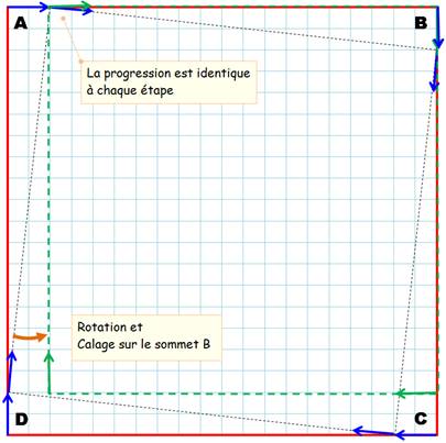 chaque étape: redressement du carré et calage en B, avec réduction du côté de