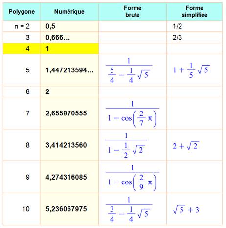 jusqu'à n = 10 (décagone). Pour n = 4, cosinus (Pi/2) vaut 0 et Dn