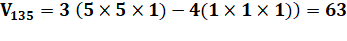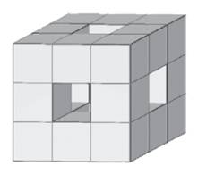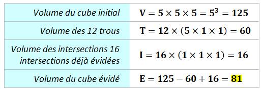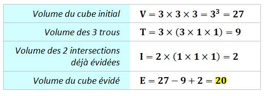 cubes déjà évidés. Volume V = 73 – 3 × (9×7) + 2 × (3×9) = 343 – 189 + 54 = 208 |