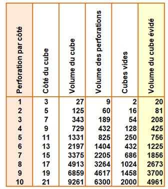 devient: 3 × k² (2k + 1). La quantité de cubes vides rencontrés durant les perforations