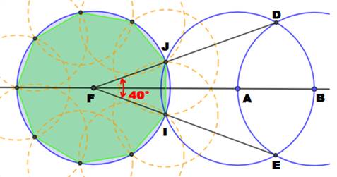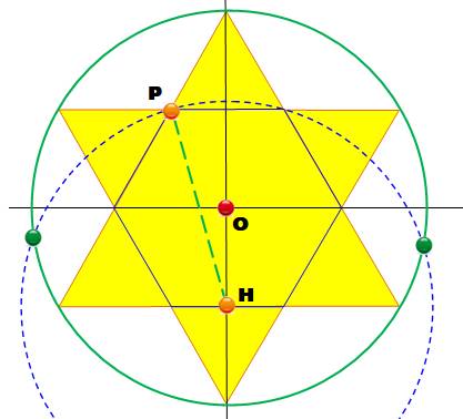 5. Segment HP qui va devenir le rayon du cercle inscrivant l'ennéagone. 6. Cercle (H, HP) => deux points verts, deux sommets de l'ennéagone. |