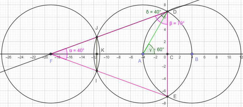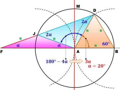 AJ. Démonstration Les triangles colorés sont isocèles et même équilatéral pour ABD. L'angle alpha en F se retrouve en A et son double