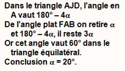 40°. Nous avons R = AB = AC = BC = 1 (Le triangle ABC