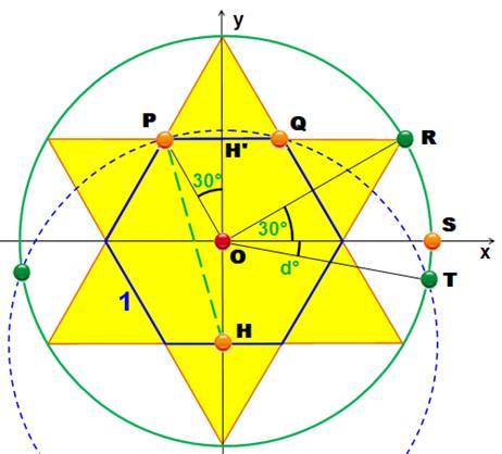 coordonnées du point d'intersection T. En prenant PQ, le côté de l'hexagone égal à 1. Le triangle OPQ est équilatéral et OP = 1. Alors: PH' = 1/2 H'O = cos(30°) HH' = 2 cos(30°) = |