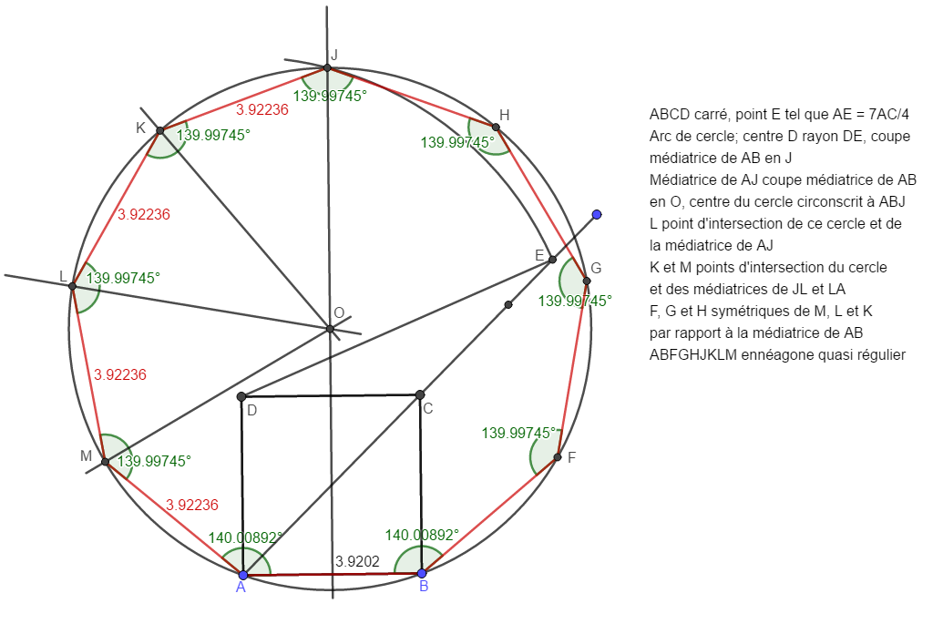Construction très simple 1. Deux points A et B 2. Cercles (A, AB) et (B, AB) => points C et D 3. Droite CD 4. Segment OC = AM 5. Cercle (O, OA) 6. Report de la distance AB sur ce cercle => ennéagone approximatif. Calcul d'erreur Nous devons vérifier que l'angle ACB est très