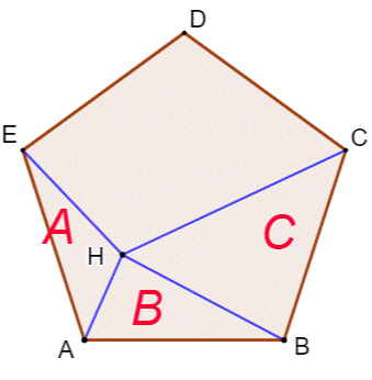 Sommaire de cette page >>> Aire de l'étoile et aire du pentagone >>> Aire d'une branche de l'étoile >>> Défi des trois triangles dans le pentagone >>> Généralisation au polygone >>> Aire du polygone via des triangles >>> Aire du polygone appliquée au pentagone >>> Avec quatre triangles – Comparaison |