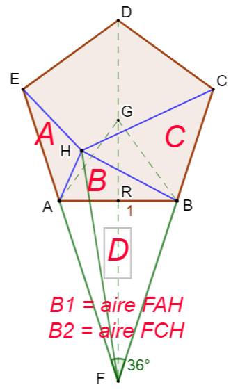 Construction La branche ABF de l'étoile. On note D l'aire de la branche. On note B1 et B2 l'aire des triangles AHF et BHF