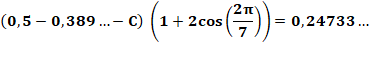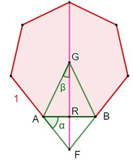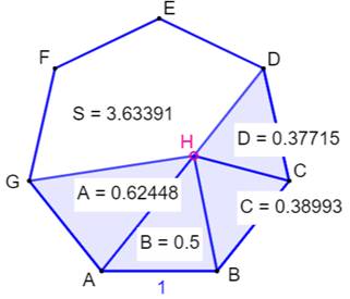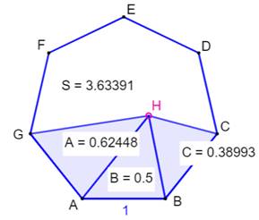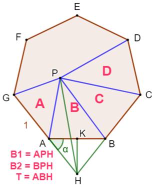 Valeurs numériques pour l'heptagone unité: AB = 1 K = 1,65597 A(ABH) = 0,31349; A(ABP) = 0,51913 A(Polygone) = 3,63391 |