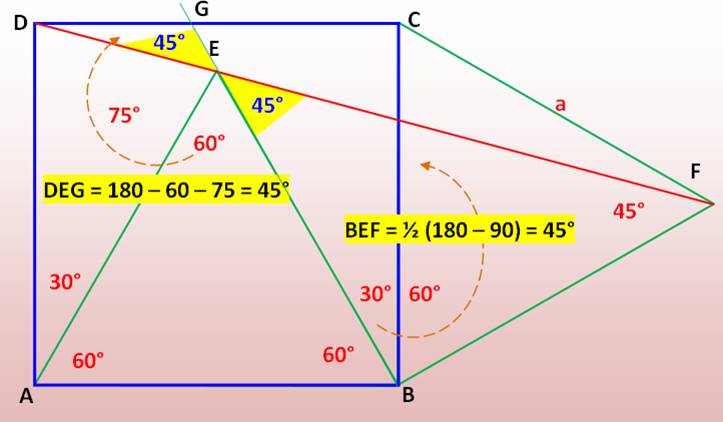 (diagonale du carré) et l'angle en B est égal à 60° (somme de trois angles,