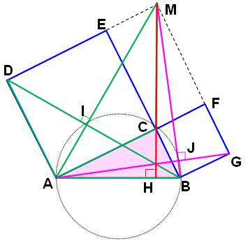 ABC, inscrit également les triangles rectangles AIB (vert) et BJG (mauve). MC étant orthogonal à AB, sont prolongement CH
