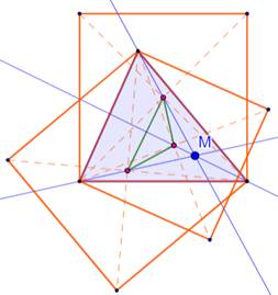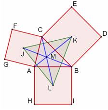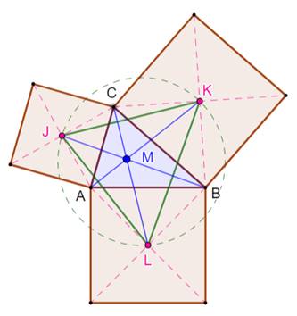 triangle de Vecten. Le point M est son orthocentre. Les deux triangles (ABC et JKL) ont même centre