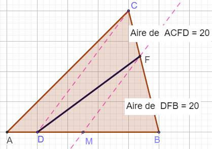 Construction Segment CB. Milieu M de AB et parallèle en B à CD. La droite DF partage le triangle en deux