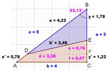 4 / 5 = 0,8 Aire BDE: 4,22 x 1,78 x 0,8 / 2 = 3 Aire ABC = 3 x 4 / 2 = 6 Aire DACE: 6 – 3 = 3 Aires (avec dimensions mesurées) Aire BDE: 3,38 x 1,78 / 2 = 3 Aire DACE: 0,47(4 + 3,38)/2 + 3,38x.76/2 = 3 |