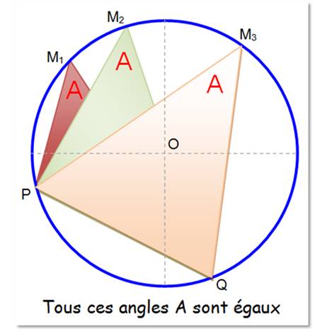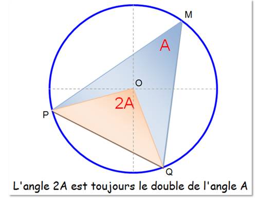 2A est l'angle au centre interceptant le même arc PQ. Théorème