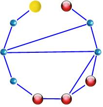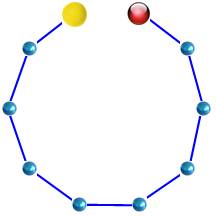 rouge) fait le tour et compte 9 arêtes. À droite Sur ce graphe les chemins de jaune à rouge nécessitent un minimum de quatre arêtes |