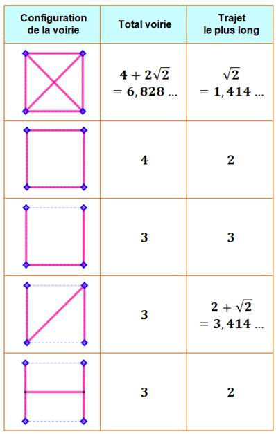 petit trajet "le plus long" avec 1, 41 km pour chacun. Pour la voirie minimum, la solution passe par des