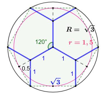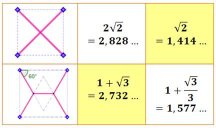 Longueur totale du réseau L = 2(0,772… + 0,365… + 0,577…) L = 3,891… |