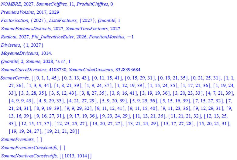2 027 = 1² + 1² + 45² = 3² + 13² + 43² = 11² + 15² + 41² = 15² + 29² + 31² = 19² + 21² + 35² = 21² + 25² + 36² = 1² + 1² + 27² + 36² … = 19² + 21² + 21² + 28² |