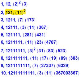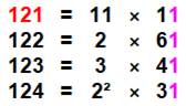 121 = 11 x 11 = 121 1331 = 11 x 11 x 11 = 1331 14641 = 11 x 11 x 11 x 11 = 14641 |