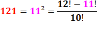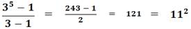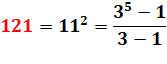 11² = 111113 = 1 + 3 + 9 + 27 + 81 = (35 – 1) / 2 = 242 / 2 |