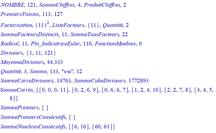 121 est la somme des diviseurs propres de ces 13 nombres (somme aliquote). Plus